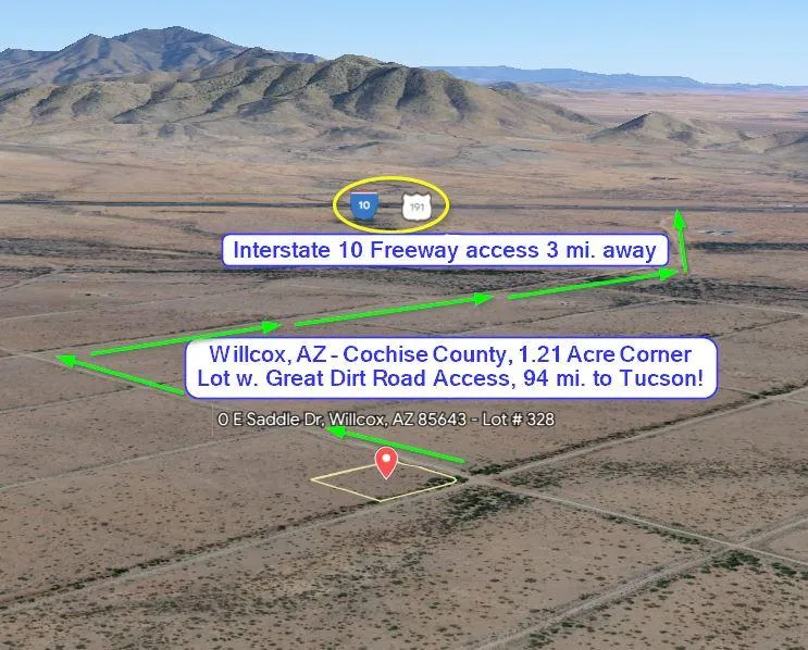 Easy access off right Interstate 10! Clean 1.21 acre corner lot in Willcox, Arizona, with no HOA, no utilities, not in flood plain, zoned SR-43 Single-Household Residential with good dirt road access only 4 miles from Interstate 10 Freeway with plenty of privacy for weekend getaways perfect for a camping site on your way to the Coronado National Forest and snow-capped Mt Graham, 35 miles away.