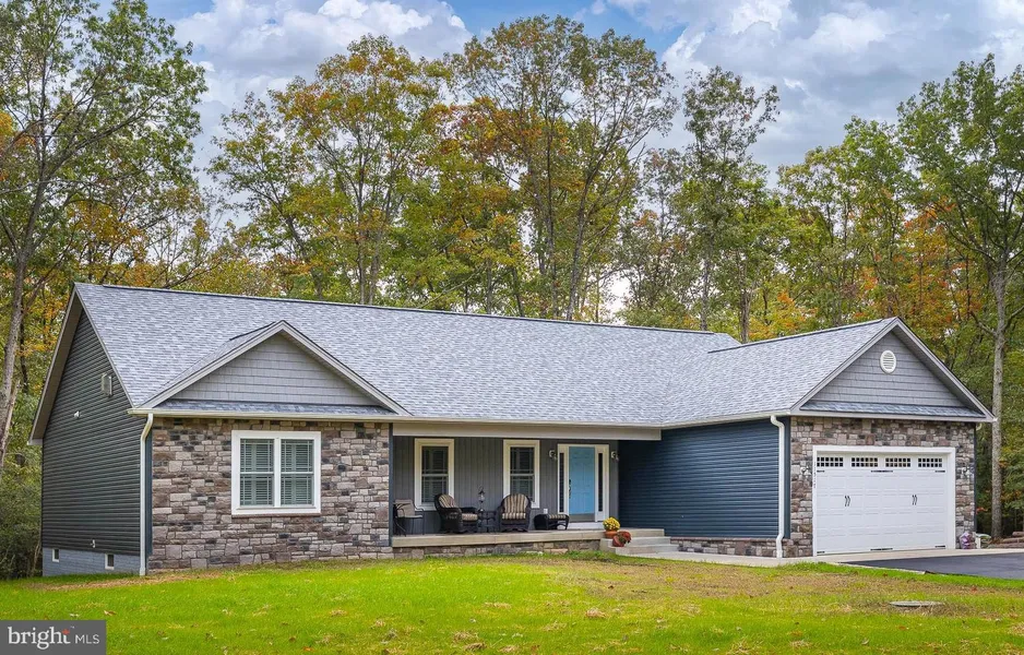 Welcome to this stunning one-level home nestled on a picturesque wooded 4-acre homesite complete with a tranquil pond. Boasting a spacious four bedroom, three bathroom open floor plan, this home offers the perfect blend of comfort and elegance. Step into the inviting living room featuring a cozy stone surrounded fireplace, ideal for chilly evenings. The gorgeous kitchen is a chef's dream, equipped with soft-close cabinets, a large island with a vegetable sink and wine rack, farmhouse sink, stainless steel appliances, tile backsplash, and granite countertops, making it perfect for both cooking and entertaining. Retreat to the luxurious primary suite, complete with his and her closets including a custom walk-in, a barn door leading to a bath adorned with beautiful custom tile work and a soaking tub. The lower level boasts a family room with a wet bar, providing the perfect space for relaxation and entertaining. Enjoy serene views from the deck or relax on the front porch overlooking the pond and neighboring farm. This home offers a truly unparalleled living experience. Pictures are of a model home and are not exact to this home's features.