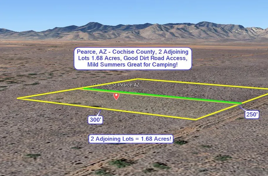2 adjoining lots equaling 1.68 acres, 85 miles to Tucson with good dirt road access in Pearce, AZ at 4,400 ft elevation with mild summers great for camping, just 7 miles to 7,000ft Mt Glenn and off-roading, 5 miles to food, gas, beer and ice at the Country Store on Highway 191, and 3.5 miles to the US Post Office, TJ's Bar & Grill, Apache Hardware, auto repair, Dollar Tree, and Sunsites Community Library in town. There is no HOA, this property is not in a flood zone and it boasts beautiful views of Mt Glenn to the west and snow-capped Chiricahua Peak at 9,000ft elevation to the east. Have a place to go outside the city for long weekends, camping and adventure!