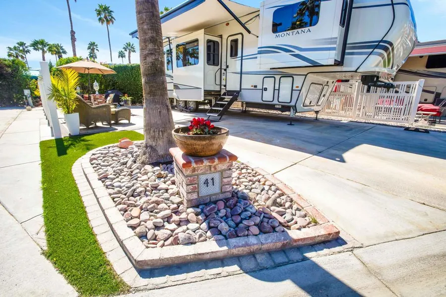 Enjoy spacious outdoor living on this expanded interior lot. Mature ficus to the rear provides privacy and fencing to the patio side creates a clean and crisp look. Conveniently near resort entry/exit and La Palma Clubhouse. Outdoor Resorts Palm Springs is a Five Star RV Resort Community combining luxury with affordability. It is a guard gated resort that sits on 137 beautifully landscaped acres with 27 holes of executive golf, 10 tennis courts, 13 pickleball courts, 8 swimming pools, a fully equipped fitness center, beauty salon/barber shop, full-service restaurant, convenience store, 2 club houses, activities, special events and so much more.