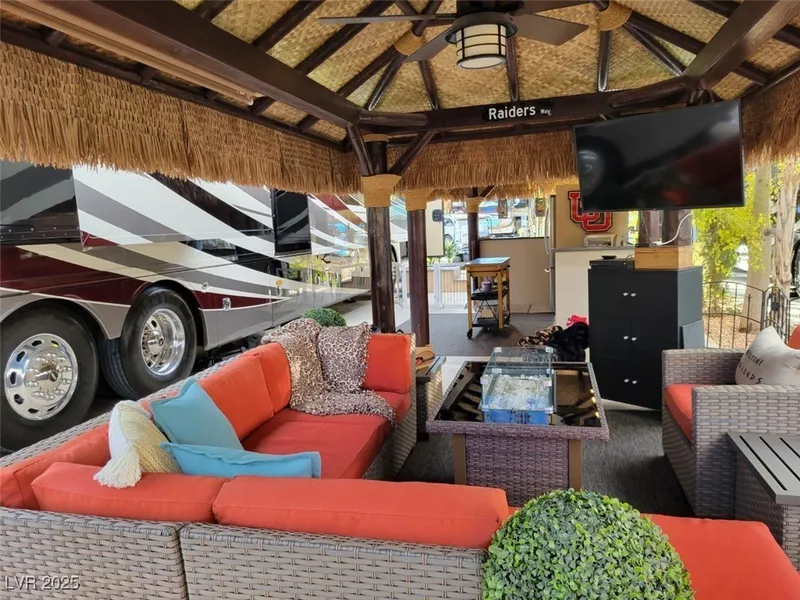 Located within the Class A Las Vegas Motorcoach Resort, this fantastic site has it all with two high-end custom rectangular palapas, outdoor kitchen with full size fridge, living room area with firepit, ceiling fans, privacy wall, lighting, and much more! OWNER WILL CARRY!