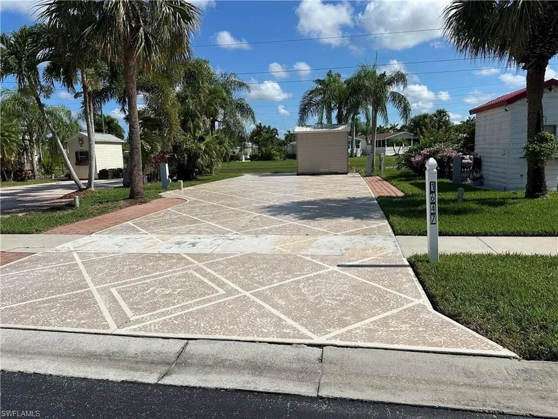 The site features a stylish decorative concrete finish, a 6x10 shed at the rear of the pad for all your storage needs, and tasteful tropical landscaping that enhances its charm. It's perfectly suited for motorhomes, fifth wheels, or travel trailers, blending convenience with resort-style appeal