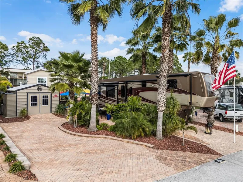 Live the good life at this 55 gated RV Resort Community. Perfect opportunity whether you are looking for a vacation home or year round living. This is a fabulous Package Deal which includes the lot plus a custom 2015 New Horizon 40 Ft. 5th wheel with many upgrades. This is the most beautiful lot with well maintained lush tropical landscaping, accent lighting, bright patio umbrellas, two waterfall fountains, brick paver pad and 12 x 16 shed. The shed offers refrigerator, washer, dryer, bath, a/c window unit, TV and fan. Note there is cold water only in the shed. In addition there are two Rubbermaid storage units. The community offers clubhouse, solar heated pool, shuffleboard, tennis/pickleball courts, exercise room and laundry facility. The Association allows 20% of owners to be aged 40 . At this time, the 20% has not been filled. The monthly dues of $171. include water, sewer and trash. This is a pet and golf cart friendly neighborhood with many social activities to enjoy, Disney, Universal, Sea World and OIA within a 30 to 40 minute drive. New Horizon 5th Wheel detailed Information included in attachments.