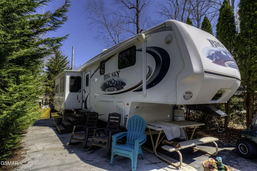This secluded RV Lot comes complete with all the amenities needed to start your own vrbo/airbnb, or simply enjoy for your private use! Golf cart is also included in this listing. This 2008 Keystone Big Sky 5th wheel 340RLQ model is equipped with the Artic Insulation Package and comes completely outfitted with all interior furniture/appliances, including sheets/bedspreads, silverware, flatware, pots/pans, plates, cups, etc.. This unit is also equipped with a gas fireplace, outdoor firepit with an abundance of comfortable chairs for entertaining friends and family! This is one that you will definitely want to view! Very reasonable HOA fee's at $700/quarter and include cable tv, hi-speed internet, water/sewer, ground maintenance, trash pick up twice daily, road maintenance, pool(s) and pets allowed! Electric service is separate and provided by Sevier Co. Electric Dept. Propane can be purchase separately on site for an additional charge. Resort amenities include a full sized laundry mat, 2 separate swimming pools, putt-putt course, playground, a stocked community lake, and is pet friendly with doggie stations located throughout the park.