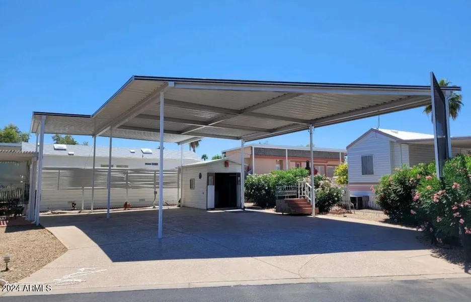 Amazing corner lot with oversized awning! This is your new slice of Paradise. Lot is almost completely shaded and big enough for any RV and large enough to add a bigger structure if needed. Lot has potential rent income, current renters at $1,250 per month. This property comes with a shed, full washer and dryer with storage. Outside dining area and partial view of the golf course. This is a 55 plus community with guarded gate and community center within walking distance of pool and plenty of activities. Come see it today!