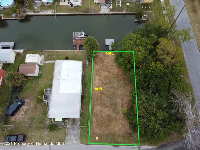 Direct Gulf of Mexico waterfront lot with seawall and newer floating dock. Zoned for SFR or manufactured. Awesome location, close to bus line, shopping, eating, Hudson Beach, Regional Medical Center Bayonet Point, Wal*Mart, Home Depot and Lowes. All within 6 miles.Aerial photographs with plot lines are approximate only, to show or highlight location.