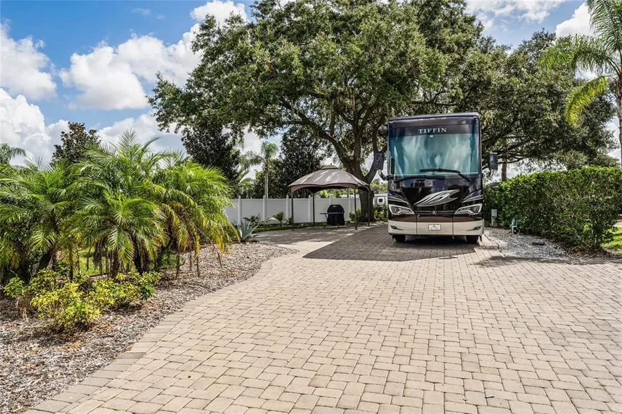 Enjoy resort living in this wonderful gated RV community. This brick paved property is shaded by beautiful Live Oak trees and offers a large yard area perfect for children and pets. In addition there is a gazebo, 10 x 10 utility shed with nearly new washer and dryer, Eco Smart instant hot water heater, BBQ grill and golf cart. There is 30 Amp, 50 Amp plus 110 service. Ideal location close to the pool, clubhouse and playground. Other amenities include laundry facilities, dog run and recreation hall with work out equipment. The condo dues include water, sewer, cable TV plus lawn maintenance. Pet friendly with some restrictions. Publix, shopping and restaurants closeby. Disney, Sea World, Universal and other attractions are within a 30 minute drive