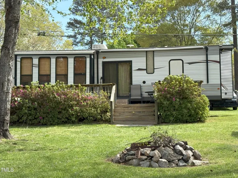 Waterfront Lot with 39' Forest River Camper - Lake Royale. Do not miss this must-see waterfront lot located in the beautiful, gated community of Lake Royale. The property includes a 2014 Forest River 39-foot destination camper, fully hooked up to water, electricity, and septic for ultimate convenience. Enjoy stunning water views from the large, attached deck, perfect for watching evening sunsets. The lot also features a private dock with boat slip and a shed for extra storage. Lake Royale offers an abundance of amenities including two beaches, clubhouse and pavilion, golf course, pickleball, tennis, basketball, and volleyball courts. Whether you're looking for an active lifestyle or a peaceful retreat by the water, this property offers the best of both worlds. Seller will consider owner financing.