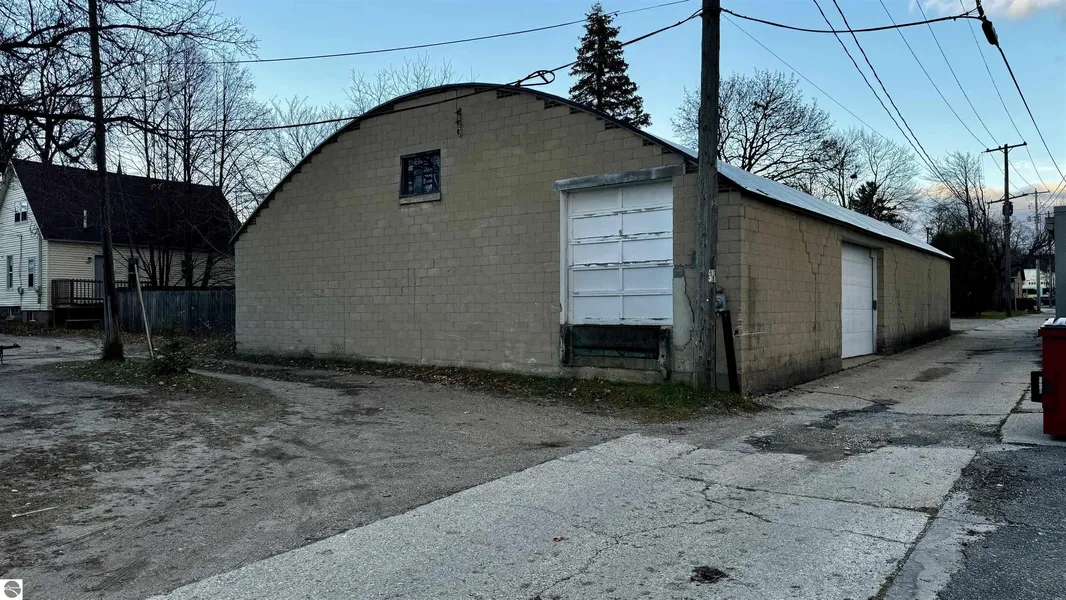 50 x 72 block warehouse building one block off Mitchell St, Downtown Cadillac. The building has a truck height loading dock and ground level overhead door. The lot has additional space for unloading or parking. There is 9' clearance under the roof beams and 15' height in between for stacking pallets. The building has had a complete new roof installed in the fall of 2024.