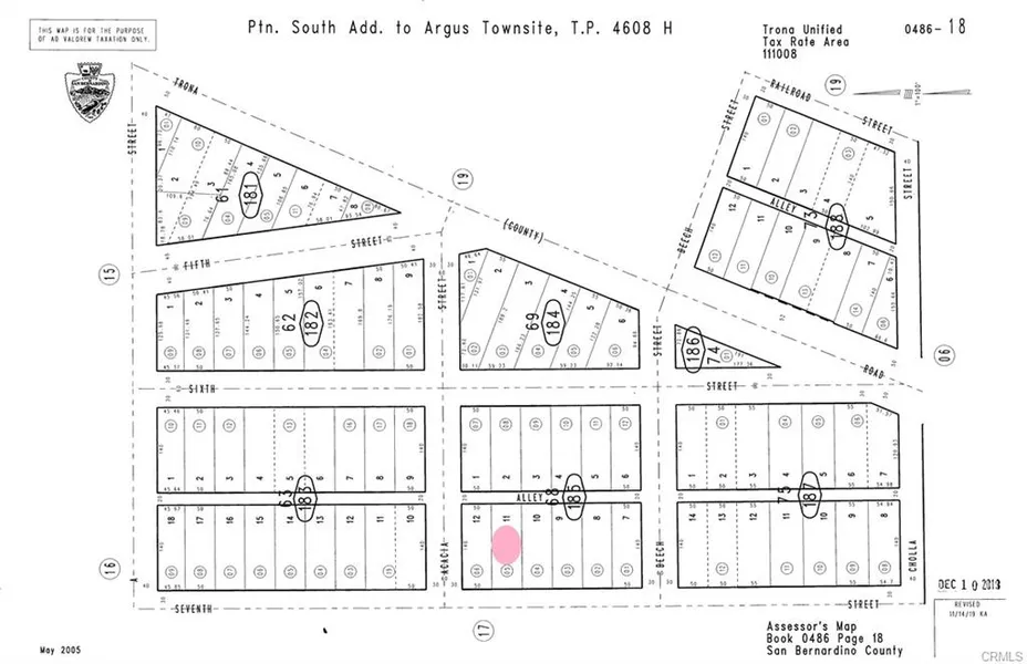Investor needed for vacant land purchase in Trona, San Bernardino county, California. Area has an easy commute to local employment and about an hour and half from Adelanto. Lot is on dirt road second in from the corner and measures 50 by 140 sq. feet. Legal description is ARGUS TOWNS1TE SOUTH ADD LOT 11 BLK 68. Parcel number is 0486-185-05-0000. Latitude and longitude coordinates are 35.742914,-117.398931 Small town living with small investment. Closest shopping/ is Ridgecrest .