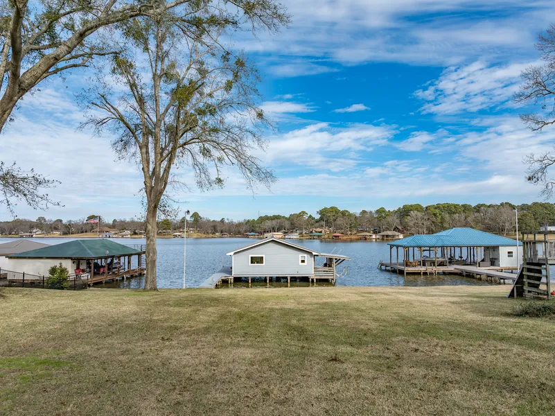 open side deck for fishing, grilling, or sitting peacefully lakeside! A metal roof and vinyl siding makes maintenance easy. Water depth is approximately 5-7' across back of boathouse when lake is at full pool. Build the lake home you have always wanted on beautiful Lake Palestine! Sprinkler system pumps from lake. Bullard school district