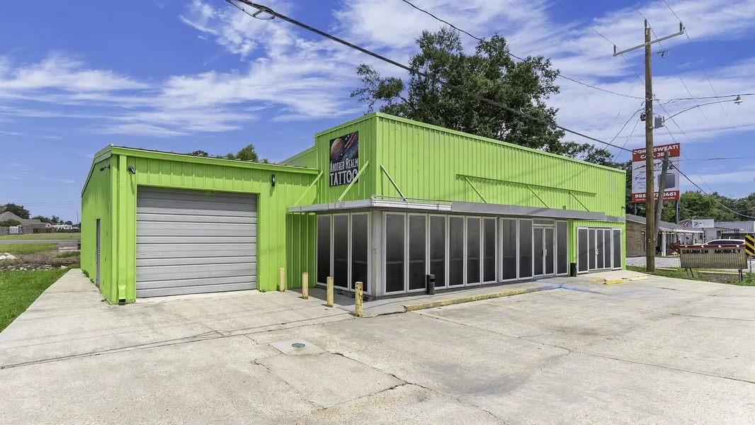 Prime commercial location! This pre-engineered steel building offers 100% heated and cooled space, including a large insulated warehouse with roll-up loading door. Previously used as a tattoo parlor, this space is ideal for an office, daycare, salon, or retail use. Excellent visibility and steady traffic flow without the congestion and risk of MLK Blvd. A standout location on the higher ridge along Bayou Terrebonne. The building sits on a 100' wide lot with strong elevation—6' per FEMSA overlay—and is located in Flood Zone X, meaning no flood insurance is required for a lender. Front and side glass display windows are fully covered with solar screens for heat and sun protection.