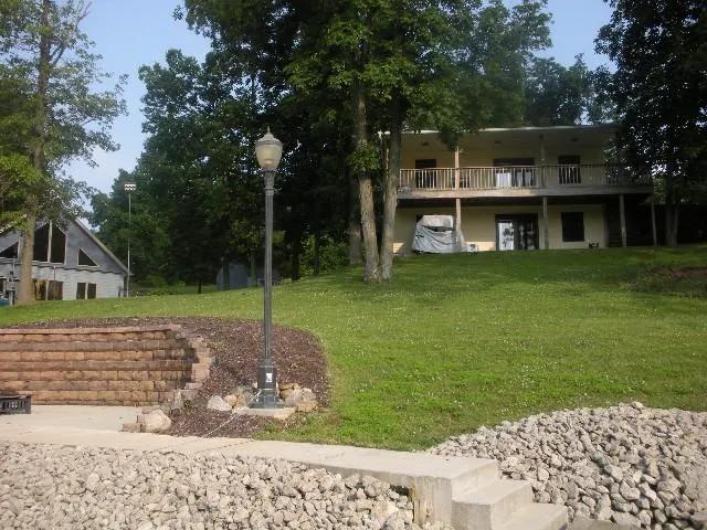 This is a charming, beautiful lakefront home. The home is in a quiet cove with quick access to the main lake. The open kitchen/dining/living room area is finished in knotty pine featuring a stone fireplace from ceiling to floor with a rustic pine log mantel. From the French doors that open onto a large covered wooden deck, you have a beautiful view of the lake. Two bedrooms and a full bath complete the first floor. The large family room is also finished, walls and ceiling, with knotty pine. A custom designed bar covers the full width of one wall, which is perfect for entertaining. This waterfront has a custom designed wooden dock with a manual boatlift on one side. There is an area to plant flowers by the patio.