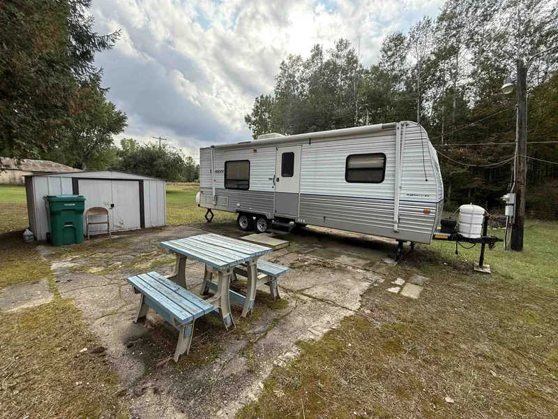 Level lot, just off a paved road with well, septic, shed, a patio and includes a nice neat & clean 2004 24 ft Poineer Travel Trailer that sleeps 6. Near ORV trails,& 35,000 acres of state land and several waterways.