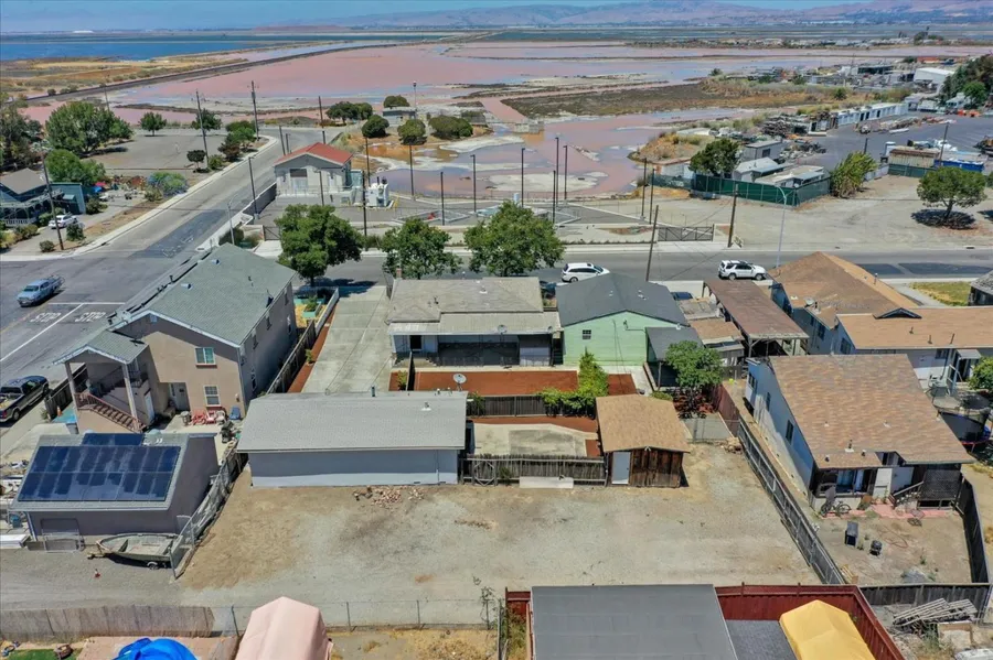 100' x 135'. 13,500 Sf Lot w/ water views! Zoned for 4-5 units/Planned Development/ Commercial Pedestrian Base District. Onsite: Main: a 2/1 (1054sf). Sep by fenced lawn area is the back1/1 home w/one car garage. Both homes are "move-in ready" while making future plans. 3rd home: 2/1 is unpermitted. Nearby is Alviso Marina State Park, Guadalupe River Trail, Don Edwards State Park, close to everything that SV has to offer: shopping, sports entertainment experiences (Top Golf & Levi Stadium). Google too!. The Related Company of NY are developing less than a mile away a "world-class destination". Complex includes 5.4M SF of commercial office space, 1280 apts, 400 extended stay apts, 1M SF of shopping, dining, entertainment + 400 room business hotel. Location is the key to all development. Located along major public transportation routes of the VTA , bus lines, ACE/Capitol Corridor rail w connections to Caltrain, Bart, along w access to highways 237,101, 880.