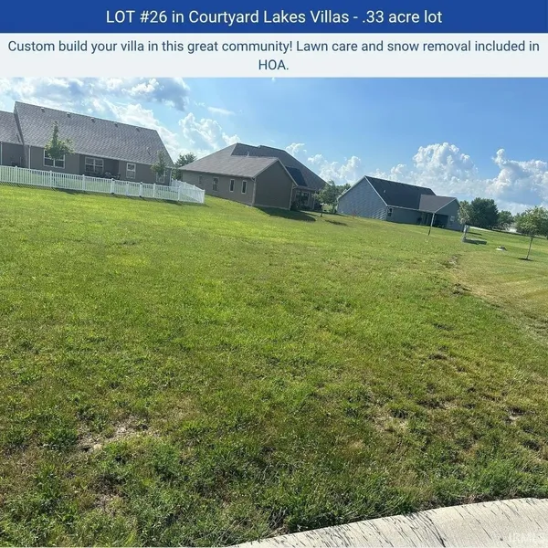 Here’s a great opportunity to build a free-standing villa in the peaceful 55+ community of Courtyard Lakes Villas in Berne, Indiana. Lot 26 sits on a quiet cul-de-sac on Hahnemann Court and offers a nice mix of privacy and friendly neighbors. This is a low-maintenance community with lawn care and snow removal included. Neighbors enjoy regular potlucks, coffee meetups, and events at the nearby senior center. While the villas share a consistent exterior style, interiors can be customized to fit your needs. While many homeowners in the community have chosen to work with Marquis Builders and have had great experiences, you’re welcome to bring your own builder to design a home that fits your style and needs. If you're looking for a quiet, welcoming neighborhood where you can build a home that suits your lifestyle, Lot 26 is worth a look.