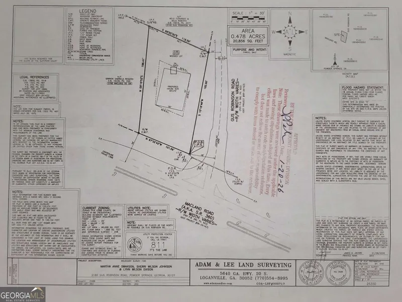 Prime residential corner lot located at Gus Robinson Rd and Macland Rd in desirable Powder Springs. Situated within Hillgrove and Lovinggood school districts, this property offers both convenience and community appeal. Enjoy easy access to shopping, dining, hospitals, and local parks, with Truist Park (Braves Stadium) about 12 miles away and Hartsfield-Jackson Atlanta International Airport just about 33 miles away. Bring your builder and your vision - this is the perfect opportunity to design and build your dream home!