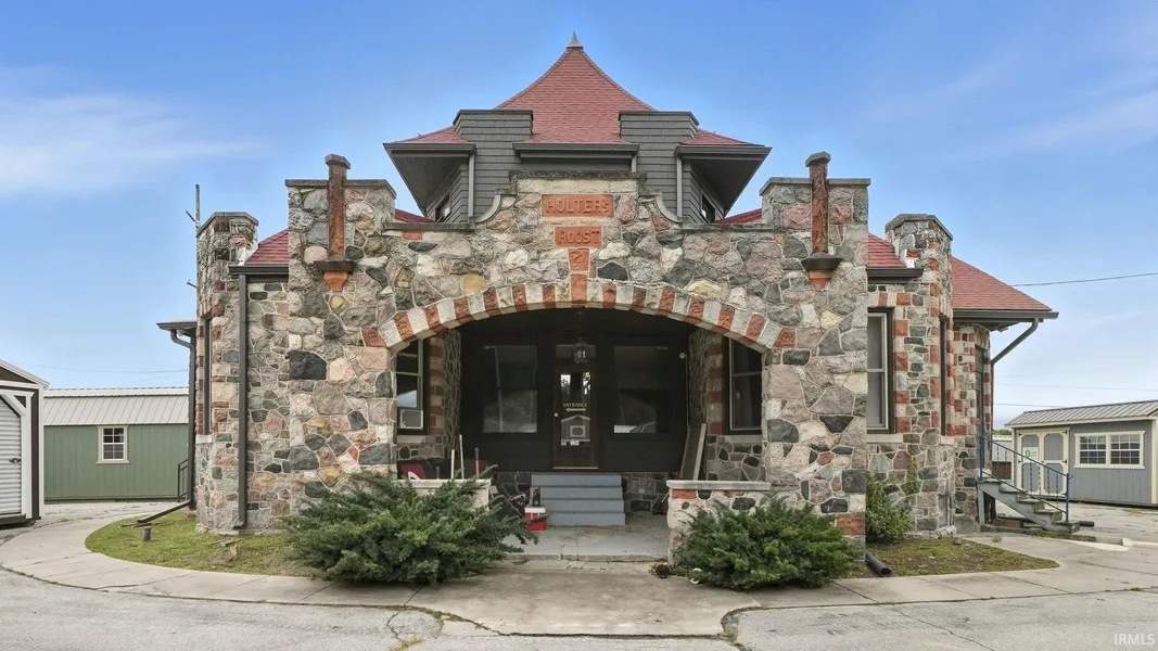 This distinctive property stands out with its stone castle-inspired architecture, instantly recognizable and full of character. Located in a prime, high-visibility area with a large parking lot surrounding the building, it’s perfectly suited for a variety of commercial uses while also offering the flexibility for partial or full living space if desired. The main floor features a welcoming front room with beautiful woodwork and an eye-catching staircase, ideal as a reception area, waiting room, or collaborative workspace. Additional rooms on this level can serve as private offices or living quarters, complemented by a kitchen and full bathroom for added convenience. Newer windows provide comfort and efficiency throughout. Upstairs, two more rooms and a half bath continue the theme of flexibility - perfect for extra offices, storage, management or personal use. Expansive covered porches extend your usable space outdoors, creating opportunities for outdoor displays, seating, or client gatherings. With its unique architecture, adaptable layout, and excellent visibility, this property is ideal for offices, a boutique, salon, creative studio, or home-based business looking for a memorable presence and functional versatility.