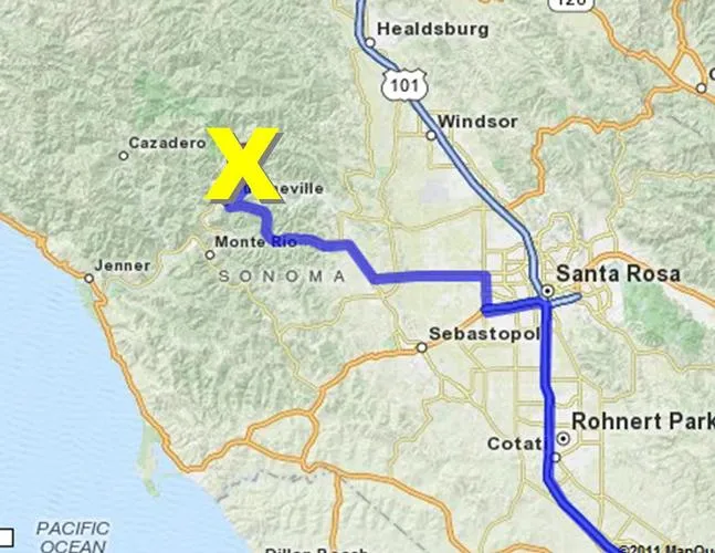Driving Directions: From Hwy 101 in Santa Rosa, take exit 488B toward Sebastopol . Turn right on Fulton Rd. Turn left on Guerneville Rd. Turn right on Gravenstein Hwy/CA-116. Turn left on CA-116/Main St/River Rd. Turn right on Armstrong Woods Rd. Turn left on Laughlin Rd. Turn right on Valley Ln. Turn left on Melody Ln. The parcel is on the left between 16391 and 16427 Melody Ln.