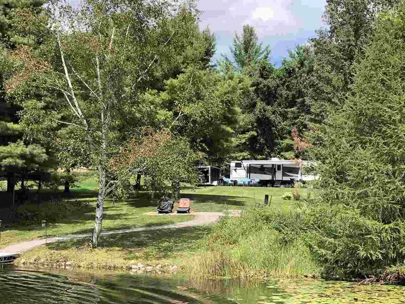 Breathtaking views of the point of the Legend Lake channel. Sandpoint well & convectional septic set up for 2 bedrm home. Build your dream home/cabin or camp! There are 2 hardscaped areas on lot. A patio for your camper area & a Permeable patio/firepit area near the waters edge. A path to the water creates a warm welcome to the water shoreline. included is a roll away maintenance free aluminum dock with a bench and a wood stained dock. Also included a maintenance free 10x10 shed (new & boxed) to replace wood shed.