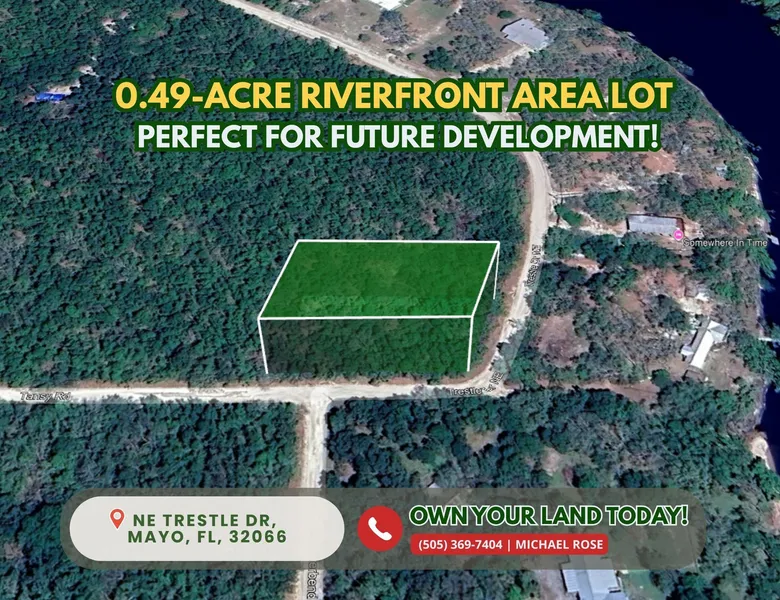 Research Parcel InformationFrom the town of Mayo, take FL-51 (E. Main St) north toward the Hal W. Adams Bridge. Cross the bridge over the Suwannee River and continue about 2 miles, then turn left onto NE Trestle Drive. Follow NE Trestle Dr for about 1/4 mile; the parcel will be on the right just before the intersection with NE Riverbend Road.