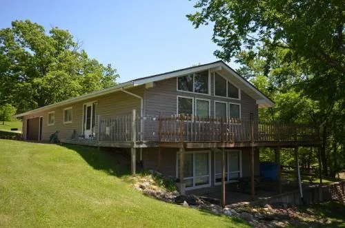 This beautiful ranch style lake-view home would make a perfect retirement lake home. Home has vinyl siding and a wrap-around deck facing the lake. This five bedroom, 2 bath home has 2 wood fireplaces with more than 2,800 sq. ft. of living space. Large footprint with tons of space. It has a spectacular view of the lake and is seated on shared commons with lake access and a community dock. The lot is almost a half an acre and is majorly landscaped all around the home. Block retaining wall runs the entire length of the house creating a beautiful patio area with an outdoor grilling fireplace. The 12x56 plus 12x28 patio is a great place to grill or relax. The large 12x20 plus 12x28 L shaped deck gives an exceptional view of the lake without the cost and maintenance of a waterfront. This homes kitchen has nice cabinets and is complete with refrigerator, range, microwave and dishwasher. The great room includes a formal dining room and living room. The living area has new hardwood installed. The master bedroom and second bedroom are on the first floor and include lots of closet space. Three additional bedrooms, a full bath and a large family room are on the lower level or walk-out basement level. The attach two car garage is 24 X 28 on the first level an additional 2 stalls tucked under the home around back. It has plenty of room for boat storage or a nice workshop. The driveway is level and was recently poured in 2009 and allows easy access year- round. The vinyl siding and roof were replaced 8 years ago. There is a new 95% LP furnace with ecm and 16 seer 2 stage high efficiency heat pump system installed in 2010. Home is on a gravity sewer system.
