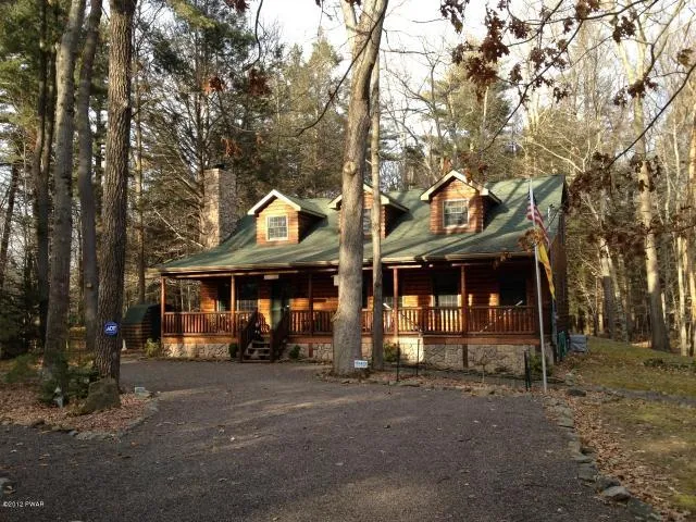 Rustic getaway at end of cul-de-sac in move in condition with 4 bedrooms, garage, stone fireplace, hardwood floors, covered porch, lake rights and boat slip included and all in desirable Woodland Hills community with privacy.
