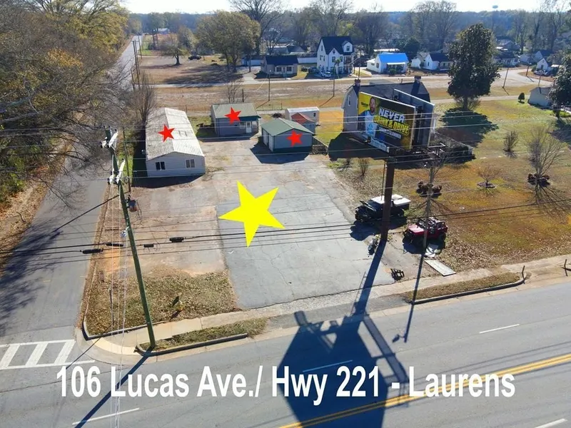 Need business space with storage? This corner property sits on a generous half-acre and has three metal buildings on lots of open asphalt parking. There's a long 2500 sqft metal Warehouse with a roll-up door (2002), a new 2-Door metal Garage-style building (2024), a 2-car carport in back, and an office-style building (1999) with front and back rooms and a half-bath on one side, and a 1-Door garage deep enough for 2 cars or storage on the other. HVAC: space heater/window-units. Per seller, the half bath has plumbing but the shower was removed, and plumbing repairs are needed to connect to public sewer. CPW confirms sewer service available at street; being SOLD AS-IS—new owner will need to address. Property is now vacant and ready for your vision. The property's main road frontage is on Hwy 221 (Lukas Ave. is a small section) and SCDOT daily traffic counts just down the road show in excess of 12,000, giving excellent exposure for your business! Lot also borders a historic side street where the CMP Watts Cotton Mill operated from 1904 through most of the 20th century making products ranging from handkerchiefs to parachute fabric. The corner lot also backs to a quiet narrow private road. Buildings are set-back far enough from the main road that this could also be a plausible small residence for someone who wants a lot of convenient, covered storage space for their stuff. Nice benefit: there is a tall outdoor billboard at the street that rents the land-space for $1200 year. Property is conveniently close to all the amenities of downtown Laurens, but just outside City Limits. What's your vision?
