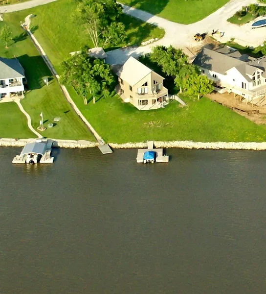 This two bedroom, two bathroom waterfront home is perfect for entertaining family and friends. The open floor plan with cathedral ceilings and large windows give a picturesque view of the lake and shoreline. The entryway opens to a large kitchen, dining and living room and is surrounded by windows featuring the lake and its many activities. The kitchen and entry way have beautiful ceramic floors with solid maple cabinets in the kitchen. The master bedroom/bathroom is on the main floor and is complete with a large walk-in closet. Sliders in the dining room lead to a 282 sq. ft. deck. The loft area is 560 sq. ft. and is currently being used as a family/TV room that overlooks the first floor great room and gives a birds-eye view of the lake. This could be used as a third bedroom. The downstairs is 975 sq. ft. giving a total of over 2500 sq. ft. of living space. It has a large open family room with sliding doors to the patio and deck. There is a large bedroom and full bath. The exterior starts with near level driveway off a quite lane. The two car garage is 24 X 24 and large enough for a car and a boat. This area is beautifully landscaped with colorful shrubs and flowers. There is a 64 sq. ft. porch that makes for a spectacular entrance. This property has a rare 142 ft. of waterfront on the main channel and is complete with a large dock.