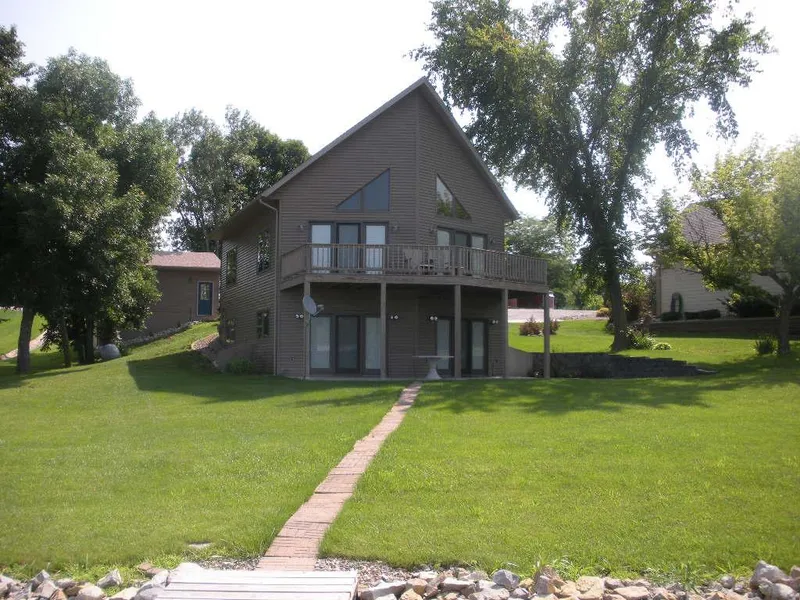 This two bedroom, two bathroom waterfront home is perfect for entertaining family and friends. The open floor plan with cathedral ceilings and large windows give a picturesque view of the lake and shoreline. The entryway opens to a large kitchen, dining and living room and is surrounded by windows featuring the lake and its many activities. The kitchen and entry way have beautiful ceramic floors with solid maple cabinets in the kitchen. The master bedroom/bathroom is on the main floor and is complete with a large walk-in closet. Sliders in the dining room lead to a 282 sq. ft. deck. The loft area is 560 sq. ft. and is currently being used as a family/TV room that overlooks the first floor great room and gives a birds-eye view of the lake. This could be used as a third bedroom. The downstairs is 975 sq. ft. giving a total of over 2500 sq. ft. of living space. It has a large open family room with sliding doors to the patio and deck. There is a large bedroom and full bath. The exterior starts with near level driveway off a quite lane. The two car garage is 24 X 24 and large enough for a car and a boat. This area is beautifully landscaped with colorful shrubs and flowers. There is a 64 sq. ft. porch that makes for a spectacular entrance. This property has a rare 142 ft. of waterfront on the main channel and is complete with a large dock.