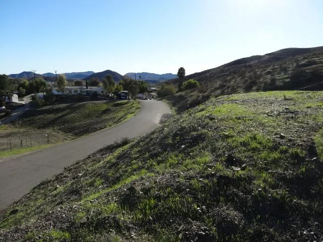 View of hills and the green valley below. Flat graded pad up off the paved street to take in the scenery. Driveway along the left side of parcel goes up to the pad.