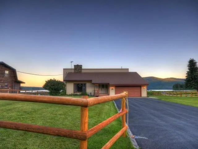 Just 8 miles west of Flathead Lake, with over 120 feet of lakefront on one of the best state-stocked fishing lakes in northwest Montana, and surrounded by thousands of acres of wilderness beyond. All the beauty and serenity of the outdoors with the nearby amenities of town. Home has great features, with stone fireplace, large decks, interesting architectural detail.