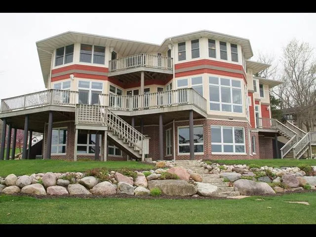 This is a very comfortable and livable lakefront home with outstanding access to the water and a beautiful view. The open kitchen/dining room area is finished in natural cherry with a see-through fireplace to the living room. There are 2 walk-in pantries & a first floor laundry room. All appliances stay, including a front loading washer and dryer. The year-round sunroom gives a bird's-eye view of the lake and its activities. It opens to a wraparound deck for viewing the abundant wildlife, the gorgeous sunsets or just watching the stars. The first floor library has a private bath and access to the deck. This could be used as an additional bedroom or home office. The second floor has five bedrooms, four bathrooms and two staircases. The master bedroom has a panoramic view of the lake and opens to a private deck. The master bathroom has a whirlpool tub and walk-in closet.