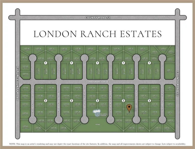Introducing London's newest gated community, London Ranch Estates, offering peaceful views of untouched farmland. Enjoy a little over half an acre home site within this community acting as a blank canvas for your dream estate. Located in the heart of London, London Ranch Estates is a gated community designed to maximize privacy and peace, while cultivating an inviting and spacious neighborhood. This intimate community features 108 homesites with each lot being a minimum of half an acre for added privacy. Community amenities to include a luxury ranch style gated entrance, community swimming pool and lazy river, pond and park. Choose your own builder and architect for your dream home on your home site and build when you're ready. Prime serene location and just minutes from the highway where you can find restaurants, shopping, and entertainment. Secure your luxury ranch style home site today! *Map is an artist's rendering and may not depict the exact locations of the site features.*