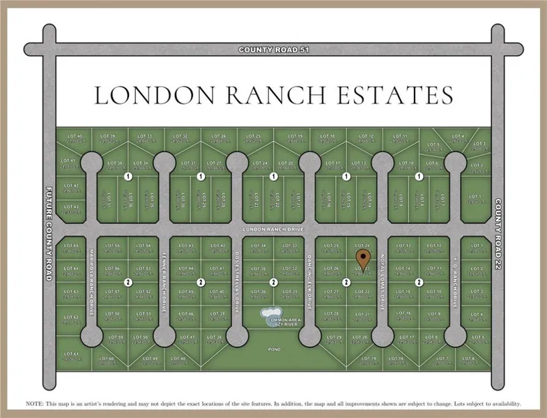 Introducing London's newest gated community, London Ranch Estates, offering peaceful views of untouched farmland. Enjoy a little over half an acre home site within this community acting as a blank canvas for your dream estate. Located in the heart of London, London Ranch Estates is a gated community designed to maximize privacy and peace, while cultivating an inviting and spacious neighborhood. This intimate community features 108 homesites with each lot being a minimum of half an acre for added privacy. Community amenities to include a luxury ranch style gated entrance, community swimming pool and lazy river, pond and park. Choose your own builder and architect for your dream home on your home site and build when you're ready. Prime serene location and just minutes from the highway where you can find restaurants, shopping, and entertainment. Secure your luxury ranch style home site today! *Map is an artist's rendering and may not depict the exact locations of the site features.*