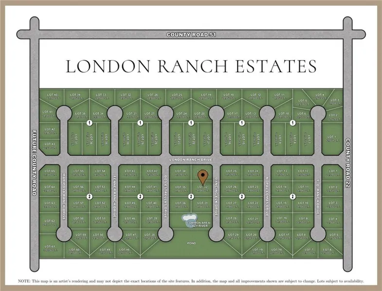 Introducing London's newest gated community, London Ranch Estates, offering peaceful views of untouched farmland. Enjoy a little over half an acre home site within this community acting as a blank canvas for your dream estate. Located in the heart of London, London Ranch Estates is a gated community designed to maximize privacy and peace, while cultivating an inviting and spacious neighborhood. This intimate community features 108 homesites with each lot being a minimum of half an acre for added privacy. Community amenities to include a luxury ranch style gated entrance, community swimming pool and lazy river, pond and park. Choose your own builder and architect for your dream home on your home site and build when you're ready. Prime serene location and just minutes from the highway where you can find restaurants, shopping, and entertainment. Secure your luxury ranch style home site today! *Map is an artist's rendering and may not depict the exact locations of the site features.*