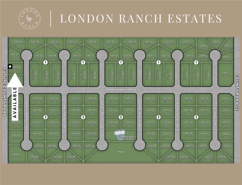 Introducing London Ranch Estates, London's newest gated community, where serene views of untouched farmland provide the perfect backdrop for your dream estate. Nestled in the heart of London, this brand new neighborhood offers expansive homesites of at least half an acre, creating a unique opportunity to design and build a custom home that fits your vision. Designed for privacy, tranquility, and elegance, London Ranch Estates features 108 spacious homesites, each thoughtfully planned to offer a balance of seclusion and community. Residents will enjoy premium amenities, including: a luxury ranch-style gated entrance for enhanced security and sophistication, a resort-style community pool and lazy river for ultimate relaxation, a scenic pond perfect for outdoor enjoyment. With no restrictions on builders or timelines, you have the flexibility to select your preferred builder and architect and start construction when you're ready. Ideally located just minutes from the highway, this prime location provides easy access to top-tier dining, shopping, and entertainment. Secure your luxury homesite today and experience the best of upscale country living! *Map is an artist's rendering and may not reflect exact site features.