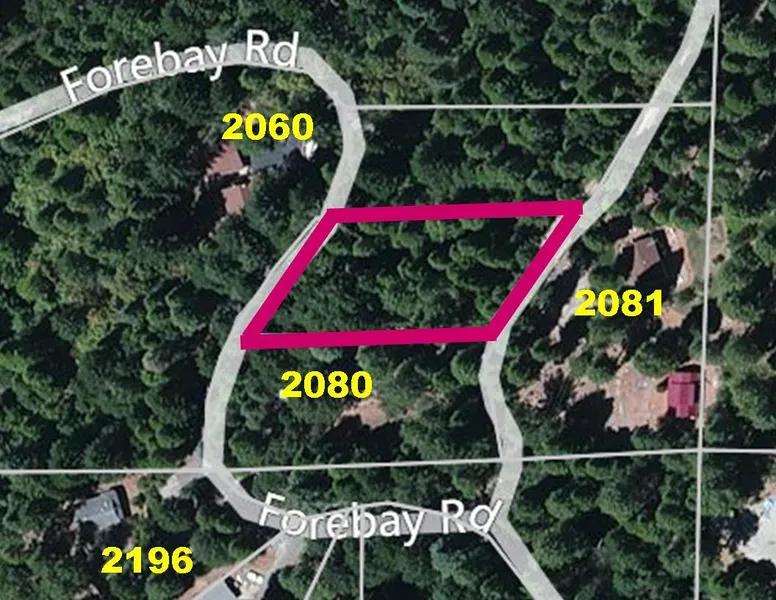 Driving Directions: From Sacramento, take Hwy 50 east. Take Sly Park Rd exit 60. Turn left on Sly Park. Turn left on Pony Express Trl. Turn right on Forebay Rd. Turn left to stay on Forebay. Parcel is on the right. Take an aerial map. Dont leave home without it.