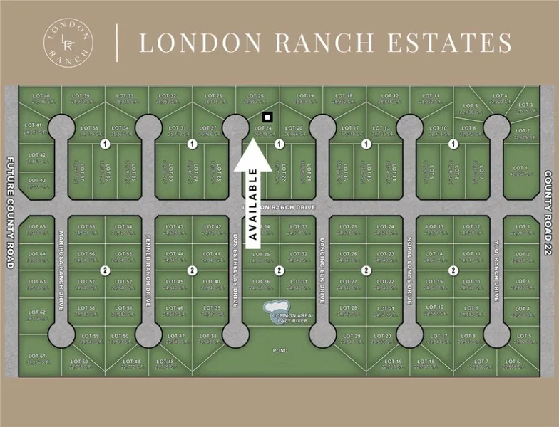 Introducing London Ranch Estates, London's newest gated community, where serene views of untouched farmland provide the perfect backdrop for your dream estate. Nestled in the heart of London, this brand new neighborhood offers expansive homesites of at least half an acre, creating a unique opportunity to design and build a custom home that fits your vision. Designed for privacy, tranquility, and elegance, London Ranch Estates features 108 spacious homesites, each thoughtfully planned to offer a balance of seclusion and community. Residents will enjoy premium amenities, including: a luxury ranch-style gated entrance for enhanced security and sophistication, a resort-style community pool and lazy river for ultimate relaxation, a scenic pond perfect for outdoor enjoyment. With no restrictions on builders or timelines, you have the flexibility to select your preferred builder and architect and start construction when you're ready. Ideally located just minutes from the highway, this prime location provides easy access to top-tier dining, shopping, and entertainment. Secure your luxury homesite today and experience the best of upscale country living! *Map is an artist's rendering and may not reflect exact site features.