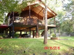 A MUST HAVE!! Rustic cedar home located on Caddo Lake/Big Cypress Bayou in a restricted, gated community with private neighborhood boat ramp. The home has 2 beds 2 baths 1,600 sqft, multiple deck and outdoor sitting areas and cook area. Open beneath, 4 cars can comfortably park without taking up sitting space or space could be easily enclosed for an extra bedroom, or game room. The home sits on metal I-beams on a concrete foundation and has all metal framing including interior studs and trusses.The living, dining and kitchen area are open with aspen walls and rustic tin ceilings with wood burning stove set on a rock base with a peeled pine mantle. Both bedrooms are spacious. The master bedroom has two walk-in closets, large bathroom with shower and separate jacuzzi tub, and built-in Browning gun safe.The guest bedroom has its own large closet with cedar walls with aspen ceilings. Resent improvements to the home include interior trim stained, exterior stain and with new batt boards and all decks and porches stained. The home sits on a beautiful, shaded, landscaped yard with 6 large cypress trees along the water's edge with an amazing view of Big Cypress Bayou. A rock retaining wall flows from the grass to the water. The yard also has a rock fire pit on the water side and sprinkler system that utilizes the river water. The back of the property houses a 24x30 insulated metal shop with cement floors, window unit ac, water plumbing and storage in the rafters. This home location also features many hunting and fishing opportunities as well as other water recreation activities.