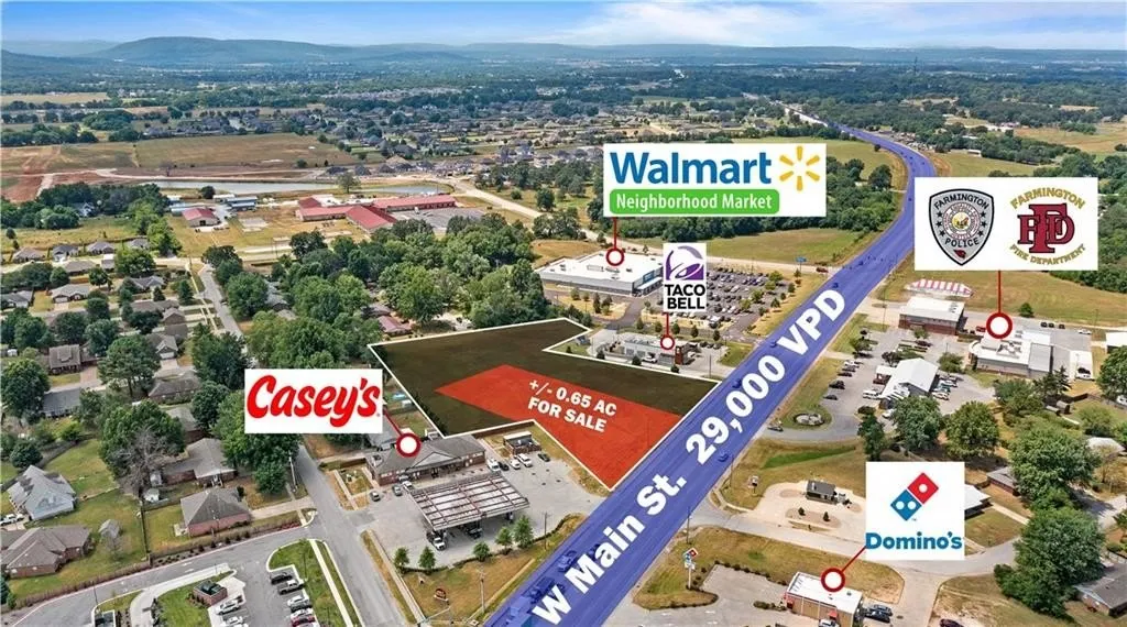 agreement with Walmart on the southwest side enhances accessibility. Utilities are conveniently available on-site or nearby. Surrounded by popular businesses, including Casey's General Store, Taco Bell, Walmart Neighborhood Market, this parcel is in a bustling area. Additionally, it is less than 1.6 miles from Farmington High School and it's newly built $16 million sports complex, and only 6 miles from the University of Arkansas. This is an exceptional opportunity to invest in a rapidly growing area!