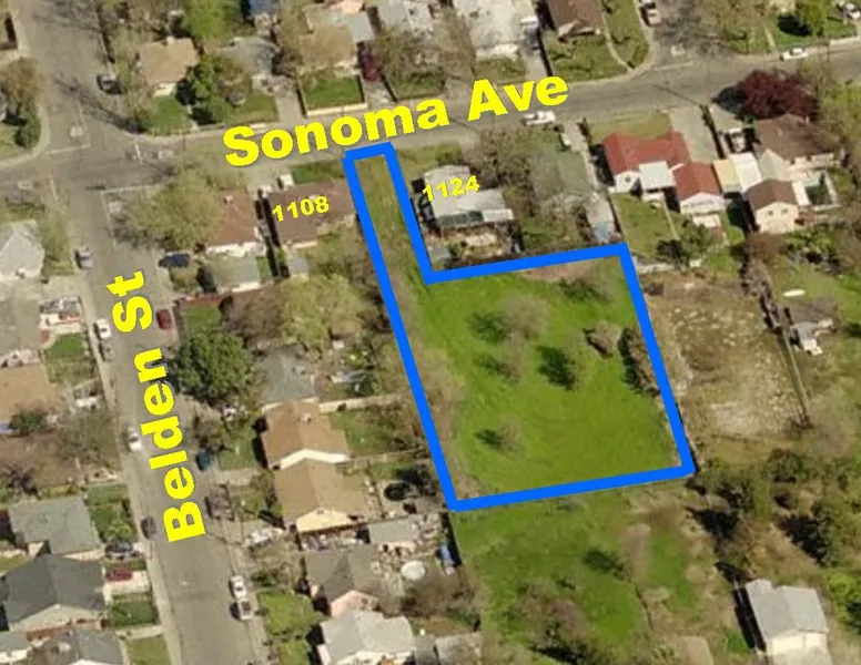 Driving Directions: From I-80 in Sacramento, take the Norwood Ave exit 90. Turn south on Norwood Ave. Turn left on Grand Ave. Turn right on Rio Linda Blvd. Turn left on Sonoma Ave. Go past Belden St and the lot will be on the right. The address of the lot is 1120 Sonoma Ave. The lot can be legally accessed by driving between the houses at 1108 and 1124 Sonoma Ave. The lot sits behind the house at 1124 Sonoma Ave. Take the aerial map with you. Dont leave home without the