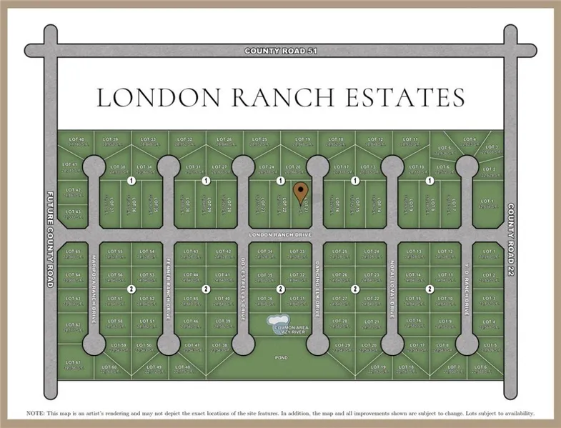 Introducing London's newest gated community, London Ranch Estates, offering peaceful views of untouched farmland. Enjoy nearly 3/4 of an acre home site within this community acting as a blank canvas for your dream estate. Located in the heart of London, London Ranch Estates is a gated community designed to maximize privacy and peace, while cultivating an inviting and spacious neighborhood. This intimate community features 108 homesites with each lot being a minimum of half an acre for added privacy. Community amenities to include a luxury ranch style gated entrance, community swimming pool and lazy river, pond and park. Choose your own builder and architect for your dream home on your home site and build when you're ready. Prime serene location and just minutes from the highway where you can find restaurants, shopping, and entertainment. Secure your luxury ranch style home site today! *Map is an artist's rendering and may not depict the exact locations of the site features.*