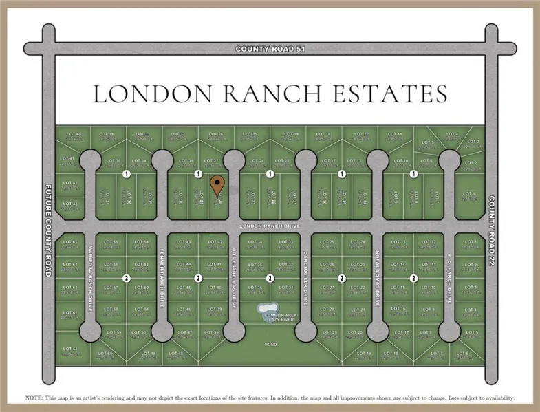 Introducing London's newest gated community, London Ranch Estates, offering peaceful views of untouched farmland. Enjoy nearly 3/4 of an acre home site within this community acting as a blank canvas for your dream estate. Located in the heart of London, London Ranch Estates is a gated community designed to maximize privacy and peace, while cultivating an inviting and spacious neighborhood. This intimate community features 108 homesites with each lot being a minimum of half an acre for added privacy. Community amenities to include a luxury ranch style gated entrance, community swimming pool and lazy river, pond and park. Choose your own builder and architect for your dream home on your home site and build when you're ready. Prime serene location and just minutes from the highway where you can find restaurants, shopping, and entertainment. Secure your luxury ranch style home site today! *Map is an artist's rendering and may not depict the exact locations of the site features.*