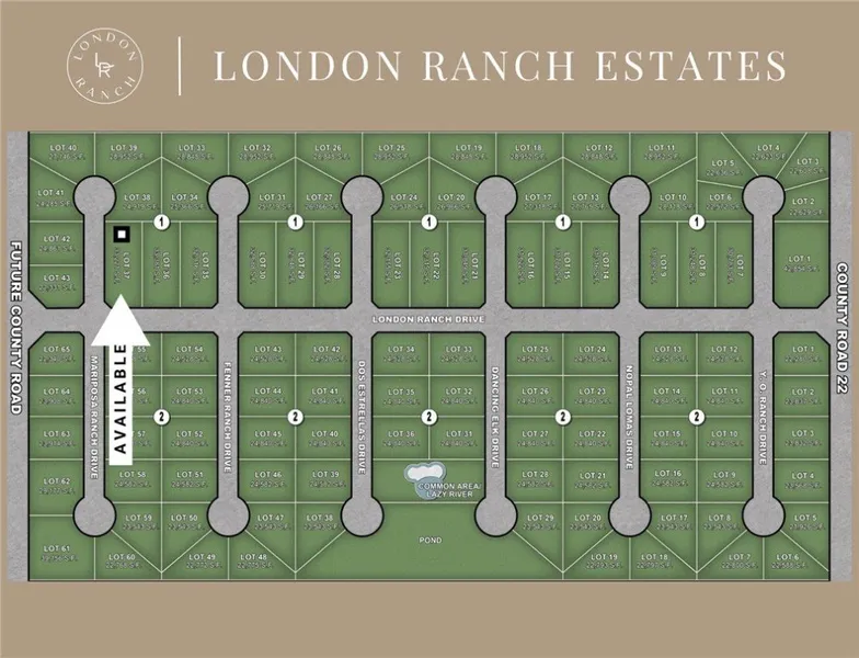CORNER LOT - over 3/4 of an acre. Introducing London Ranch Estates, London's newest gated community, where serene views of untouched farmland provide the perfect backdrop for your dream estate. Nestled in the heart of London, this brand new neighborhood offers expansive homesites of at least half an acre, creating a unique opportunity to design and build a custom home that fits your vision. Designed for privacy, tranquility, and elegance, London Ranch Estates features 108 spacious homesites, each thoughtfully planned to offer a balance of seclusion and community. Residents will enjoy premium amenities, including: a luxury ranch-style gated entrance for enhanced security and sophistication, a resort-style community pool and lazy river for ultimate relaxation, a scenic pond perfect for outdoor enjoyment. With no restrictions on builders or timelines, you have the flexibility to select your preferred builder and architect and start construction when you're ready. Ideally located just minutes from the highway, this prime location provides easy access to top-tier dining, shopping, and entertainment. Secure your luxury homesite today and experience the best of upscale country living! *Map is an artist's rendering and may not reflect exact site features.