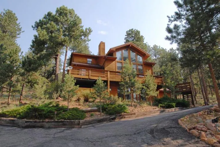Great mountain home nestled on a beautiful 3/4 acre lot with mature trees and Pikes Peak views. Great room features a stucco fireplace, vaulted ceilings, hard wood floors and a 2-story wall of windows to take in the views and add sun to the bright open atmosphere of the home. The spacious kitchen has a built-in desk area, walk-in pantry with laundry room, breakfast bar, tile countertops and Jennaire range/oven. Walk out to the deck and huge private back yard fully fenced, ready for kids and pets. The master retreat has a sitting area, private deck, walk-in closet and attached bath with walk-in shower and double vanities. The walk-out lower level is host to a spacious family room and a theater room ready for the big game or family movie nights. Relax in the hot tub as you enjoy the great mountain surrounds and views or stay inside and let the sauna take away all the stress of a busy day. Other extras include central vacuum system, trash compactor, paved driveway, large garage with workshop area, recessed lighting, window coverings and dry bar in the family room.