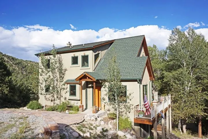 Colorado mountain home that has it all! Chalk Creek frontage, private, end-of-the-road setting, adjoins BLM land, and a beautiful custom home. The 3-story, 3112 SF home has 5 bedrooms and 3.5 baths. Vaulted ceilings and slate gas fireplace in the living area, Granite counter counter tops in kitchen. Art alcoves and nooks. Main level master suite has a jetted tub and separate shower. You can go to sleep listening to the creek. All rooms are very spacious. Several decks on all levels overlooking the creek and beautifully treed lot. Spend some time fishing, roast some marshmallows and watch the sun sink behind the mountains, or spend some quiet time on the creek banks. A beautiful home in a magnificent setting.