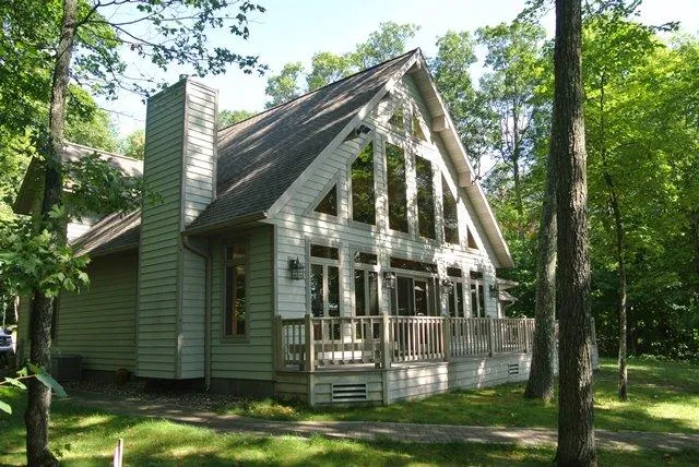 Fence Lake Chain chalet w/ 125 ft of SouthEastern Exposure at the end of the road with private, park like setting. This beautiful 1.5 story home incorporates a wall of windows offering big lake views immediately when you enter the open concept floor plan. Northwoods elegance integrates hickory cabinets, Oak flooring, solid surface countertops, tile backsplash, great room w/ fieldstone fireplace & open cedar cathedral ceilings. Spacious main floor gathering area, excellent for entertaining. Two master suites & a timber frame sun room featuring a large wrap around lakeside deck. Lower level is partially finished w/ a family room & utility area. Attached 4 car garage with drive through, as well as a (46 X 30) det garage with huge loft space for extra storage. This home has been lovingly cared for, immaculate & move in ready. Enjoy life on the point w/ fantastic big water views & a moderate slope (only 13 steps) to the sand/rock shoreline. NOTE: Private road will be improved in Fall '15.