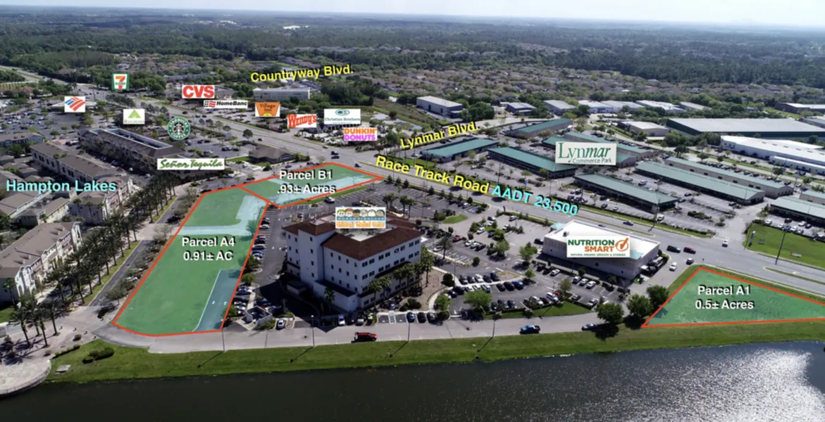 PROPERTY DESCRIPTION - The opportunity is to develop 3 separate parcels consisting of .50 Acres (parcel A1), .93 Acre (parcel B1) & .91 acres (parcel A4) located off of Race Track Road. The .5 acre parcel located south of Stowbridge Ave. has 208 feet frontage directly on Race Track Road. The second .93 acre parcel has 182 feet of frontage on Race Track Road. The third parcel, .91 acre, is located behind the North Pinellas Children's Medical Center Westchase. The parcels can be sold separately.