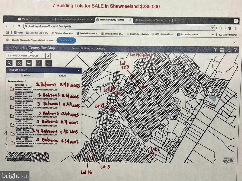REDUCED by $20k! CALLING ALL BUILDERS!! 7 BUILDING LOTS for $215,000 (being sold as a bundle) located in Shawneeland in Frederick County, VA. . Perc approved certification letter, plat and sewer docs on file for each lot. The lots range in size from 0.40-0.92 acres. Potential home sites for permanent home or weekends and vacations. Enjoy hiking, fishing, swimming in the lake, nature walks and playgrounds for the kids. Maintenance of roads, common areas, amenities, snow plowing etc managed by Shawnee Land Sanitary District/Frederick County. Sanitary District Tax just $190 for unimproved lot. Shawneeland (also known as Shawnee Land) is a residential community located on the eastern slopes of Great North Mountain. Lots included by tax ID #: 49A3-1-BB-E has 2 Bedroom perc on 0.40 acres; 495A5-1-Q05 has 2 Bedroom perc on 0.61 acres; 49A5-1-R-15 has 3 Bedroom perc on 0.49 acres; 49A06-1-W-66 has 3 bedrooms on 0.63 acres; 49A06-110-48 has 3 Bedroom perc on 0.71 acres; 49A07-1-5-223A has 3 Bedroom perc on 0.92 acres; 49A08-111-190 has 3 Bedroom perc on 0.54 acres. DETAILS for EACH LOT ARE IN DOCUMENTS. Contact listing agent with questions.